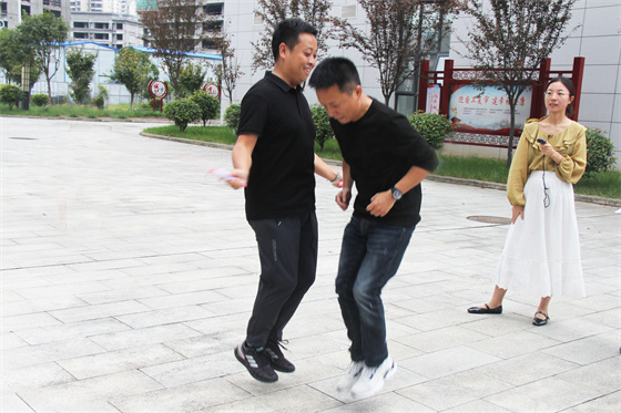 雙人項(xiàng)目考驗(yàn)的是默契度和耐力,不少組合也亮點(diǎn)紛呈,有面對面跳的,有側(cè)身對面跳的,還有背對著跳的,不管姿勢如何,共同的節(jié)奏是保持勝利的關(guān)鍵,當(dāng)然雙人跳到最后還得拼體力,不少選手氣息節(jié)奏被打亂,但大家都咬牙堅(jiān)持,沒人選擇放棄,哪怕絆亂了繩子一次次重來也要堅(jiān)持到最后一秒,周圍同事也不斷為場上選手加油鼓勁,氣氛相當(dāng)熱烈。