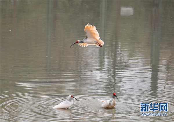 陜西洋縣朱鹮生態(tài)園內(nèi)的朱鹮。新華網(wǎng) 汪艷攝