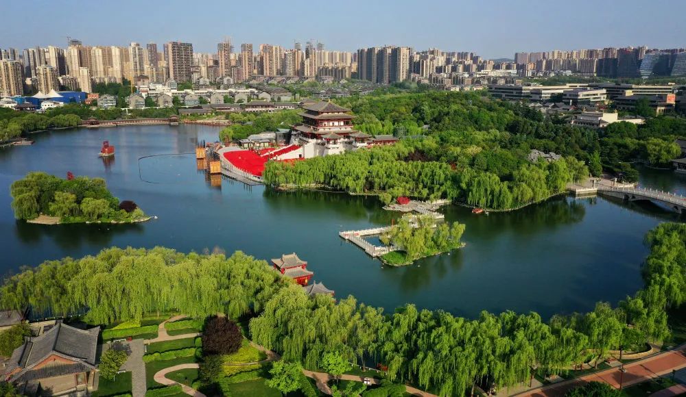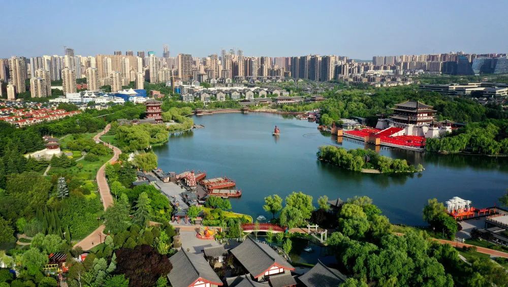 ↑西安大唐芙蓉園(4月25日攝,無(wú)人機(jī)照片)。新華社記者 劉瀟 攝