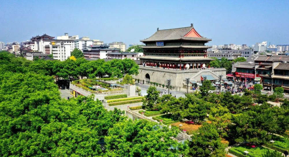 ↑西安鼓樓(4月25日攝,無(wú)人機(jī)照片)。新華社記者 劉瀟 攝