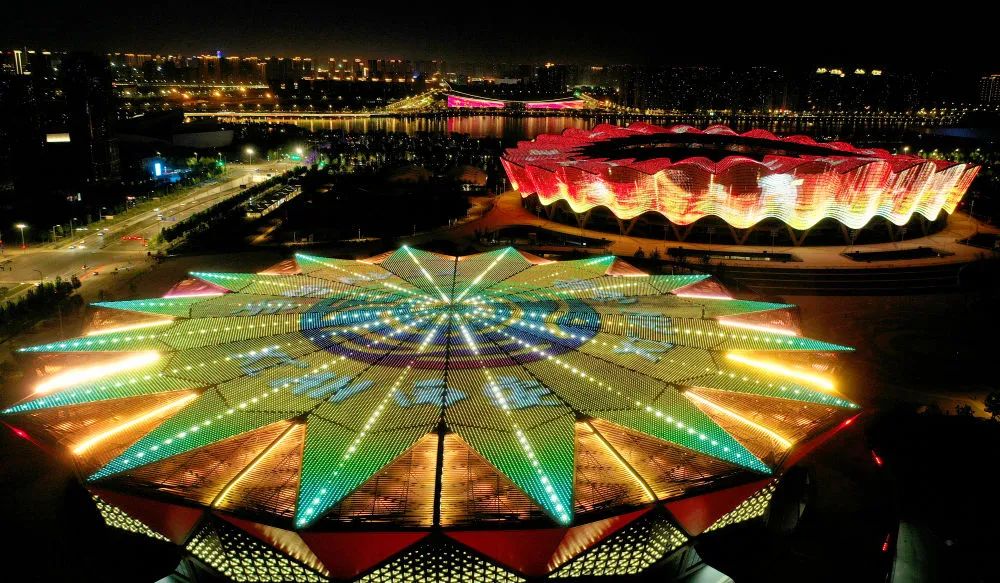 ↑位于西安國(guó)際港務(wù)區(qū)的西安奧體中心(5月1日攝,無(wú)人機(jī)照片)。新華社記者 劉瀟 攝