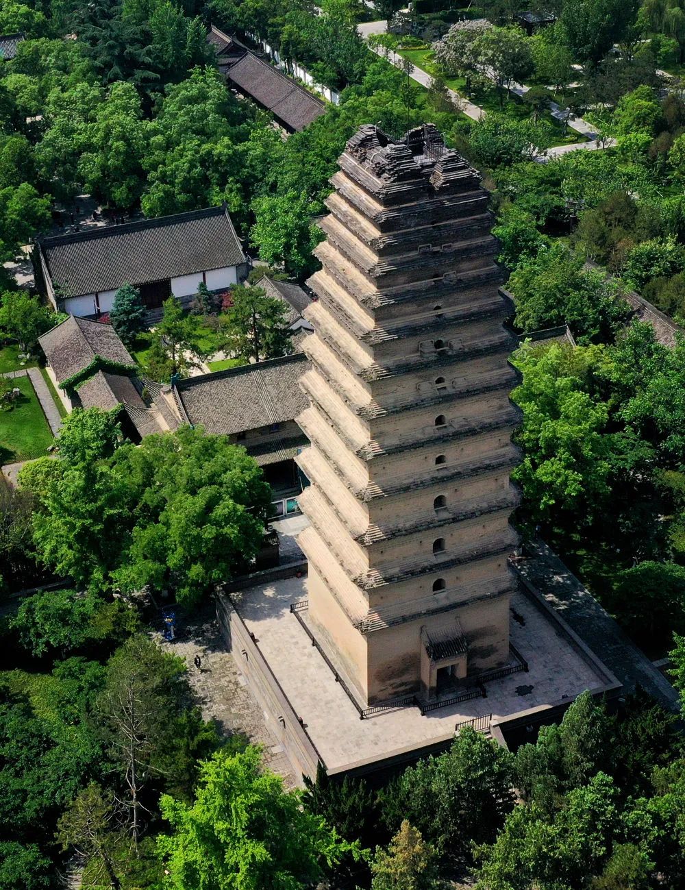 ↑西安小雁塔(5月8日攝,無(wú)人機(jī)照片)。新華社記者 劉瀟 攝