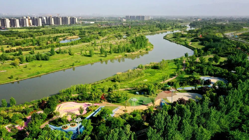 ↑位于西安浐灞生態(tài)區(qū)的灞河兩岸景色(4月16日攝,無(wú)人機(jī)照片)。新華社記者 劉瀟 攝