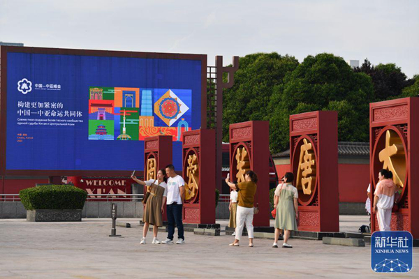 ↑5月16日,游客在西安市北大街上與中國-中亞峰會主題裝置合影。新華社記者 李一博 攝