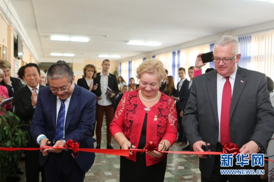 中國(guó)駐白俄羅斯大使館臨時(shí)代辦羅占輝(左)、白俄羅斯第12中學(xué)校長(zhǎng)佩特魯莎(中)和白俄羅斯教育部長(zhǎng)卡爾邊科共同為中國(guó)文化與文字中心剪彩。新華社記者魏忠杰攝
