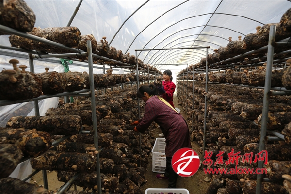 △ 茅坪鎮(zhèn)茅坪社區(qū)大力發(fā)展木耳、香菇等食用菌特色產(chǎn)業(yè),讓村民們?cè)诩议T口增收。