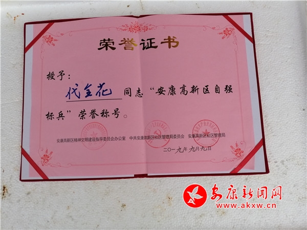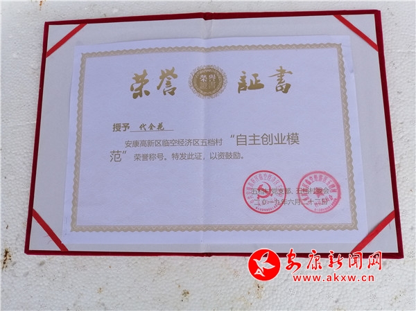 筆者從陳斌口中得知,2019年6月,代全花分別被安康高新區(qū)和五檔村黨支部、村委會授予“自強標兵”和“自主創(chuàng)業(yè)模范”榮譽稱號,去年一家成功實現(xiàn)了脫貧。 kNL安康新聞網(wǎng)