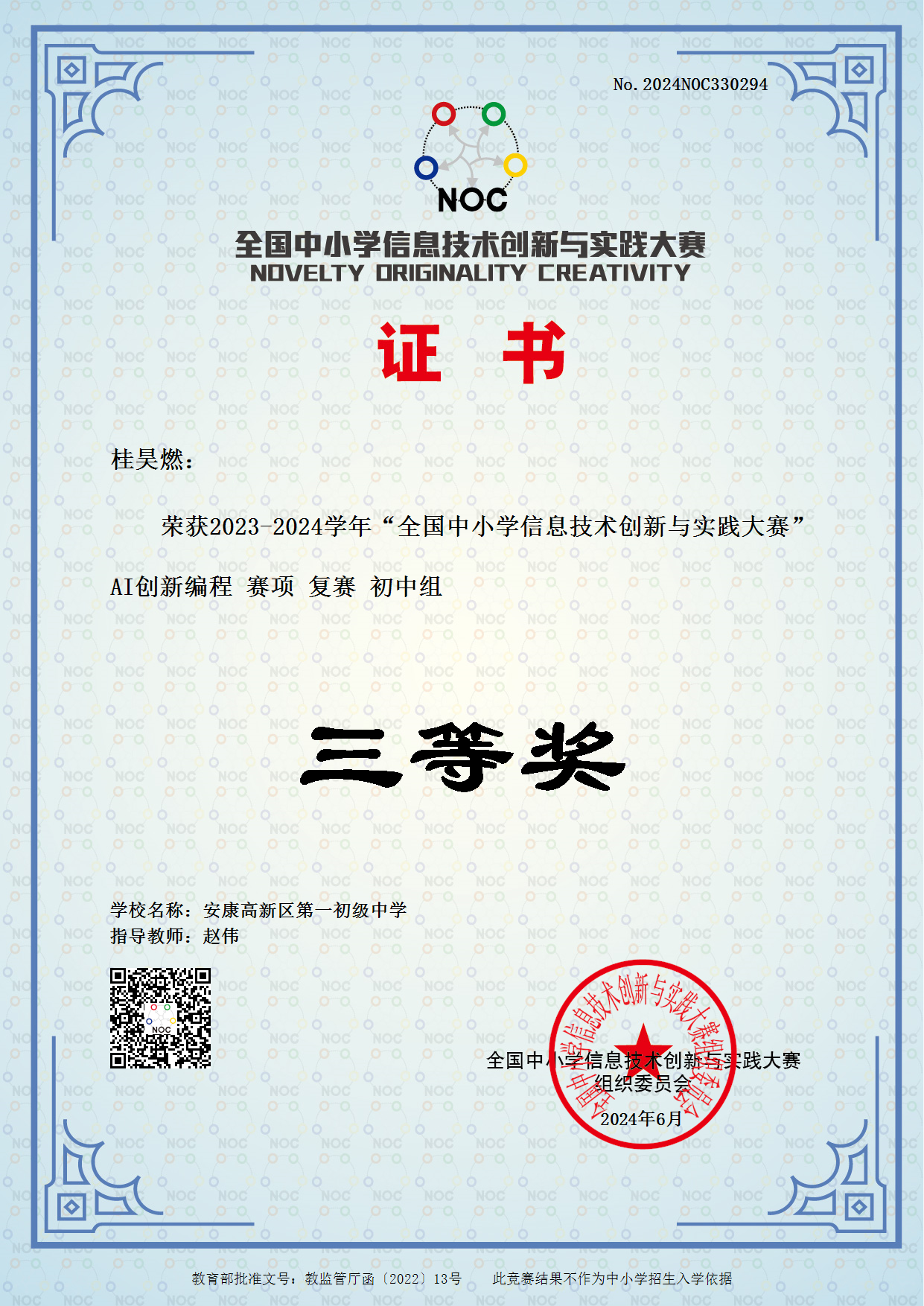 本網(wǎng)訊(通訊員 趙偉)近日,高新區(qū)第一初級中學(xué)桂昊燃同學(xué)在全國中小學(xué)信息技術(shù)創(chuàng)新與實(shí)踐大賽復(fù)賽中榮獲三等獎,該生由趙偉老師指導(dǎo)。