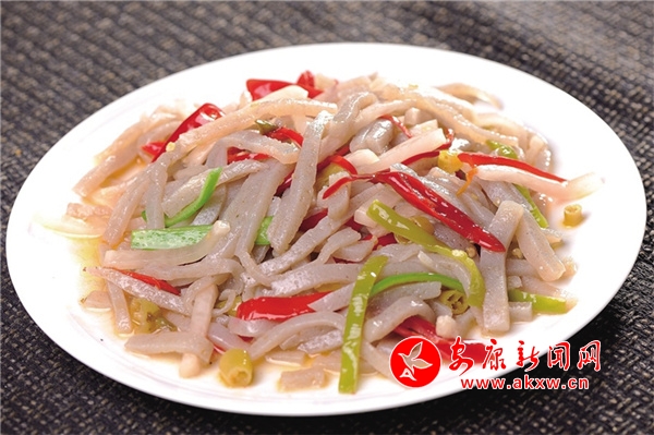酸辣魔芋:是嵐皋特色名菜,也是當(dāng)?shù)胤沁z項(xiàng)目之一。以秋收后鮮魔芋漿汁為原料,加入堿水煮制,冷固后呈豆腐形狀,切塊后與當(dāng)?shù)嘏莶艘黄鸫蠡鸱炊伞Dв笾械?ldquo;堿”和泡菜中的“酸”完美結(jié)合,具有保護(hù)腸胃、排毒養(yǎng)顏、減肥瘦身的功效,同時還能降血糖、降血脂、降血壓。嵐皋民諺“要見好公婆,多吃鬼腦殼”,說的是姑娘吃了魔芋豆腐,瘦體健身、容光煥發(fā),能得到公婆的好感,F(xiàn)代醫(yī)學(xué)認(rèn)為,魔芋豆腐中含量最大的葡萄甘露聚糖,具有強(qiáng)大的膨脹力,超過任何一種植物膠的黏韌度,既可填充胃腸,消除饑餓感,又因所含熱量微乎其微,故能控制體重、減肥健美。此外,魔芋豆腐既能開胃化食,又能清除腸道垃圾,有防癌抗癌的神奇魔力,享有“防癌魔衣”“神奇食品”的美譽(yù)。2yV安康新聞網(wǎng)