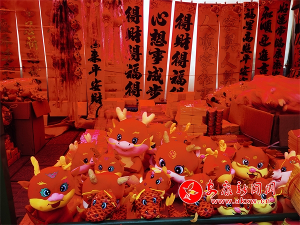 攤主劉女士說:“雖然今年過年時間比較晚,但是我們的年貨已經(jīng)早早備齊了,最近大家買對聯(lián)的熱情高漲,在新的一年祝愿大家龍年行大運、發(fā)大財,龍年吉祥。”