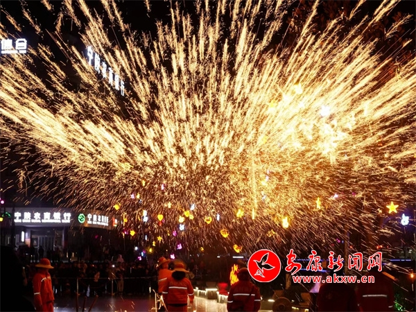 19:30,在寧陜縣中心廣場(chǎng),伴隨著鏗鏘有力的鑼鼓聲,寧陜縣傳統(tǒng)文化活動(dòng)表演開(kāi)始。舞獅、陜南花鼓、民間小調(diào)等傳統(tǒng)民俗節(jié)目輪番上演,為現(xiàn)場(chǎng)群眾送去了豐富的民俗文化大餐。而在傳統(tǒng)文化表演中,最吸引人的是打鐵花,只見(jiàn)表演者將提前加熱好的鐵水猛力擊打,絢爛的鐵花在空中綻放,放眼望去,一串串耀眼的鐵花在空中散開(kāi),猶如煙花綻放,又似流星滑落,令人驚艷。