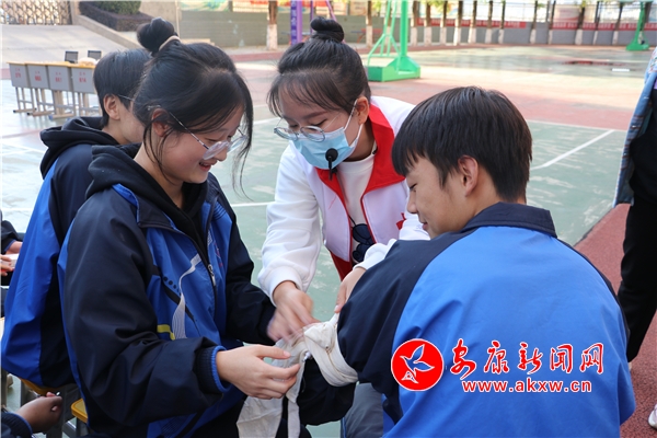 活動中,縣紅十字會工作人員向?qū)W生發(fā)放了三角巾,現(xiàn)場向?qū)W生講解了三角巾的結(jié)構(gòu)和各部分的功能,并以手臂、肩部和胸部三個部位受傷為例做了操作示范,手把手地指導(dǎo)學(xué)生如何包扎、如何敷料、如何固定、如何打結(jié)。同學(xué)們邊觀察邊實操,不時和工作人員進行互動,尋求專業(yè)指導(dǎo),親手體驗三角巾包扎的操作流程,在鍛煉動手實踐能力的同時,掌握身體受傷的應(yīng)急處理技能,增強應(yīng)對突發(fā)事件的自護自救和科學(xué)救護能力。