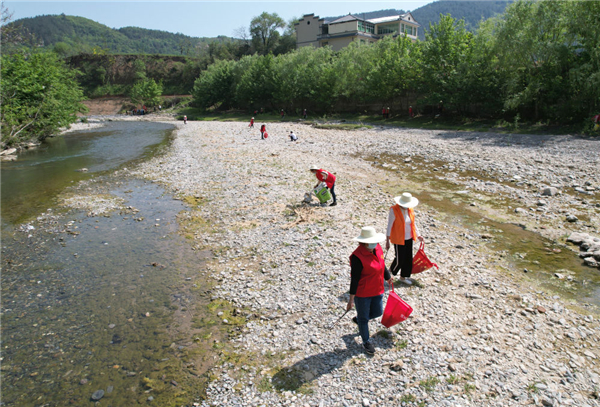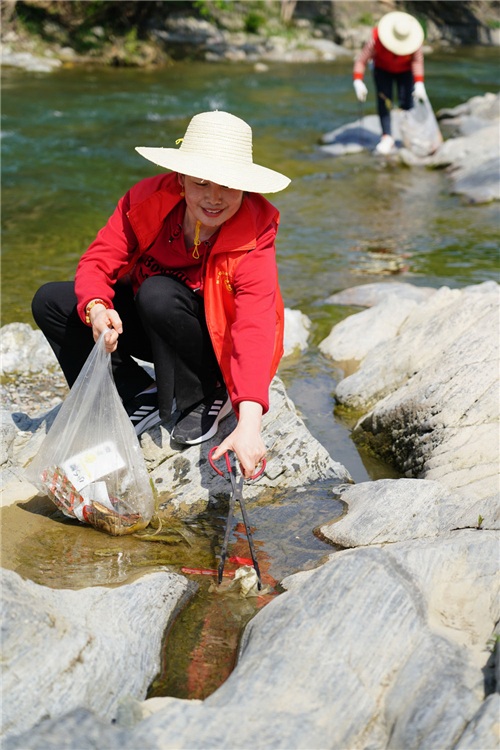 4月10日,女子志愿護(hù)河隊(duì)隊(duì)員在陜西旬陽(yáng)市雙河鎮(zhèn)高坪社區(qū)河邊撿拾垃圾。