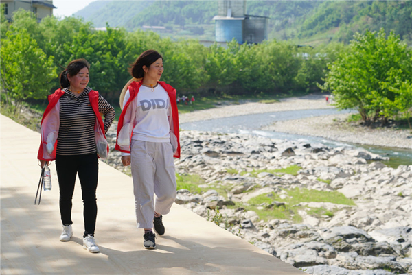 4月10日,在陜西旬陽(yáng)市雙河鎮(zhèn)高坪社區(qū)河道旁,女子志愿護(hù)河隊(duì)隊(duì)員撿拾完垃圾后離開(kāi)。 新華社記者 邵瑞 攝