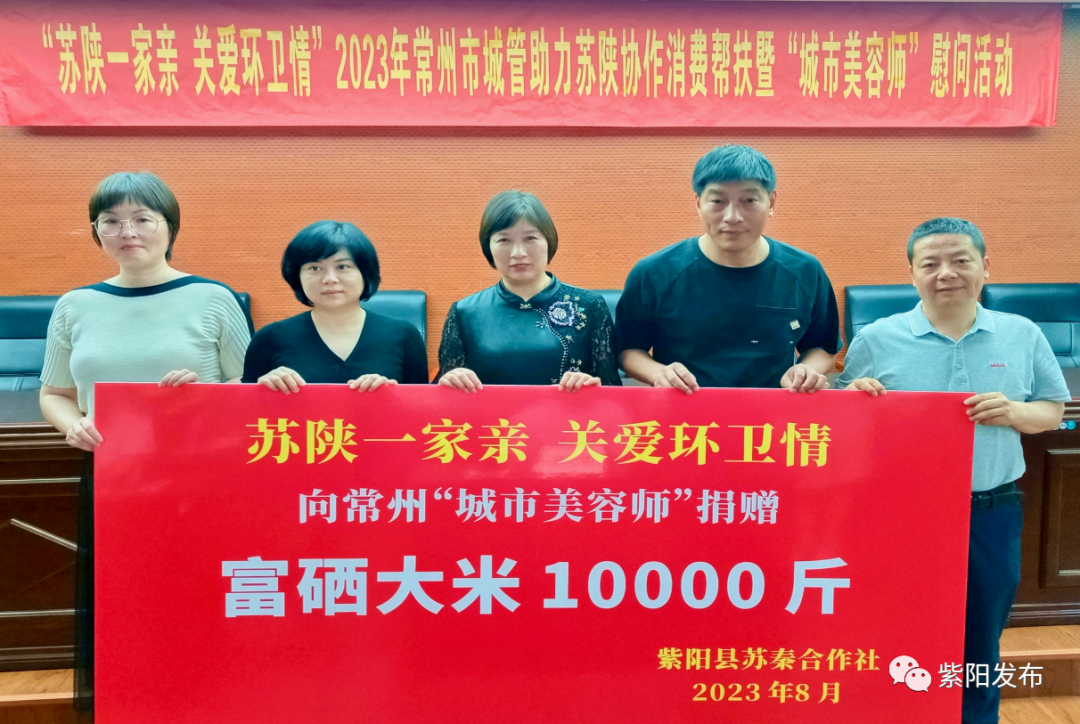 活動上,紫陽縣蘇秦農(nóng)產(chǎn)品專業(yè)合作社向常州市環(huán)衛(wèi)工人捐贈了10000斤紫陽大米作為慰問品,并與10家企事業(yè)單位簽訂了消費(fèi)幫扶產(chǎn)品購銷意向協(xié)議。