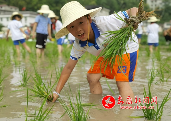 本網(wǎng)訊(通訊員 牟楓 劉成軍)6月7日,紫陽縣高橋鎮(zhèn)中心小學(xué)392名學(xué)生在老師的帶領(lǐng)下,伴隨著初夏氣息,嗅著撲鼻的泥土芳香,整齊有序地來到該縣夢紫陽中小學(xué)勞動實(shí)踐基地,開展“知農(nóng)事,學(xué)農(nóng)耕,惜農(nóng)食”插秧勞動實(shí)踐活動。
