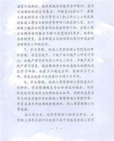 按照省政府有關(guān)文件規(guī)定,學(xué)員修滿規(guī)定的課程學(xué)分,完成畢業(yè)論文,通過論文答辯及評(píng)審后,由陜西工商管理碩士學(xué)院頒發(fā)畢業(yè)證書和學(xué)力證明。學(xué)員在省內(nèi)單位晉級(jí)和使用時(shí),視同工商管理碩士。dmu安康新聞網(wǎng)