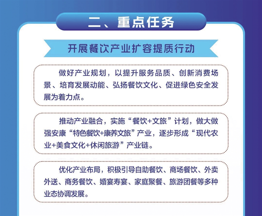 日前,安康市商務(wù)局等11部門聯(lián)合發(fā)布《關(guān)于進一步推進全市餐飲業(yè)高質(zhì)量發(fā)展的實施意見》,本期帶您一圖讀懂其重點任務(wù)。QNg安康新聞網(wǎng)