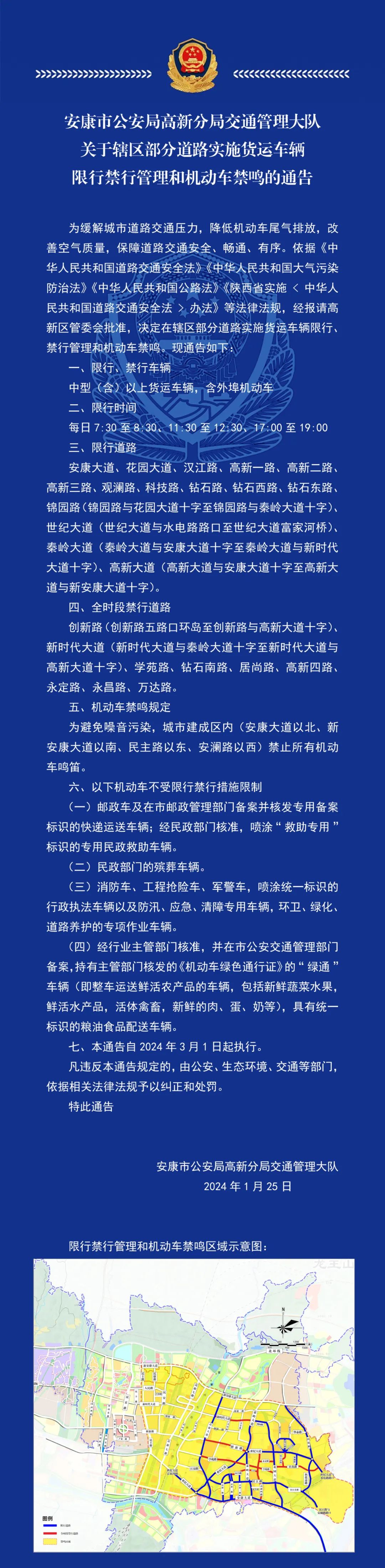 安康高新交警發(fā)布公告:轄區(qū)部分道路實(shí)施貨運(yùn)車輛限行禁行管理和機(jī)動車禁鳴