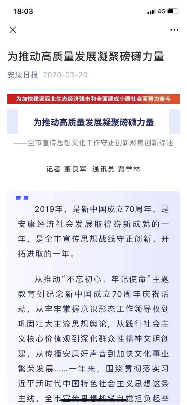 積極踐行和弘揚(yáng)“四個(gè)自信”,在安康日?qǐng)?bào)微信公眾號(hào)發(fā)布地方發(fā)展各行業(yè)多角度綜述文章、深度評(píng)論,以及干部職工干事創(chuàng)業(yè)的典范事跡。《為推動(dòng)高質(zhì)量發(fā)展凝聚磅礴力量》《“擔(dān)當(dāng)作為”“干事創(chuàng)業(yè)”……這些榮譽(yù)他們值得》《后浪推著前浪走,青年推著時(shí)代走》等作品,全面展現(xiàn)國(guó)家富強(qiáng)、人民幸福和社會(huì)和諧的中國(guó)夢(mèng)圖景。