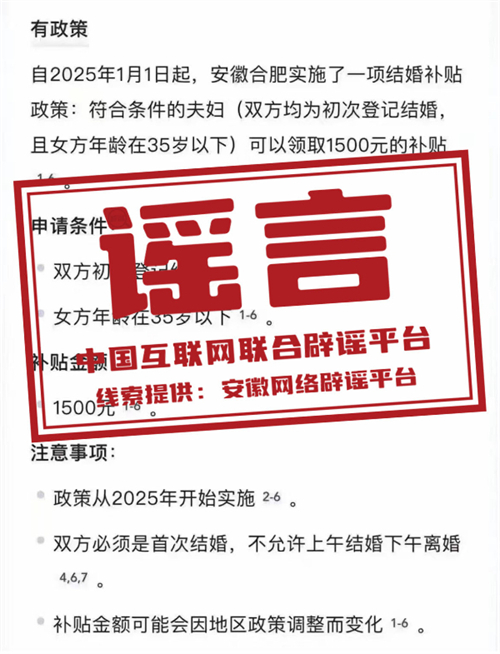 真相:近日,有網(wǎng)民發(fā)布消息稱(chēng)“自2025年1月1日起,安徽合肥實(shí)施結(jié)婚補(bǔ)貼政策”“初次結(jié)婚登記可以領(lǐng)取1500元補(bǔ)貼”“下載相關(guān)APP即可領(lǐng)補(bǔ)貼款”,引發(fā)關(guān)注。對(duì)此,合肥市民政局發(fā)布聲明稱(chēng),網(wǎng)傳消息為謠言。合肥市并未研究、出臺(tái)有關(guān)結(jié)婚登記的補(bǔ)貼政策,望廣大網(wǎng)民注意甄別。(來(lái)源:“安徽省互聯(lián)網(wǎng)違法和不良信息舉報(bào)”微信公眾號(hào))