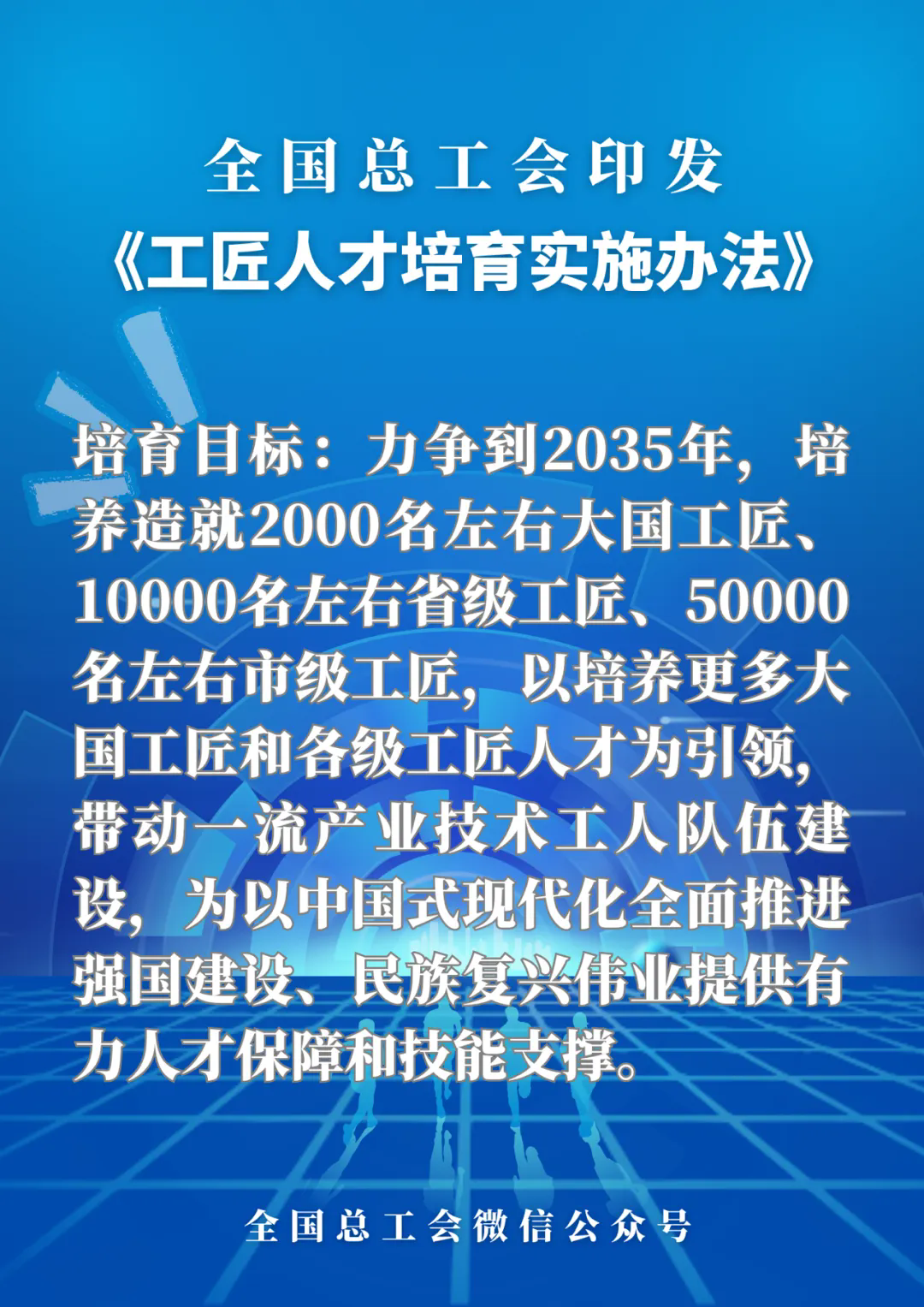 第二條 培育目標(biāo)是,力爭到2035年,培養(yǎng)造就2000名左右大國工匠、10000名左右省級工匠、50000名左右市級工匠,以培養(yǎng)更多大國工匠和各級工匠人才為引領(lǐng),帶動(dòng)一流產(chǎn)業(yè)技術(shù)工人隊(duì)伍建設(shè),為以中國式現(xiàn)代化全面推進(jìn)強(qiáng)國建設(shè)、民族復(fù)興偉業(yè)提供有力人才保障和技能支撐。
