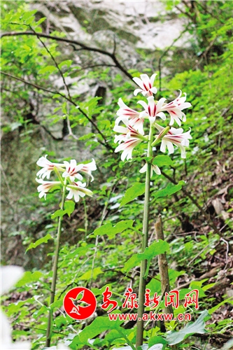 大百合生長在溪邊的山坡上,筆直的莖稈約一人高,如箭沖天,下部散有幾片寬大的綠葉,上端擎著若干喇叭狀的花兒,潔白中透著紫紅,驚艷得如同一位亭亭玉立卻羞紅了臉的美人。(圖/文 榮海) AWg安康新聞網(wǎng)