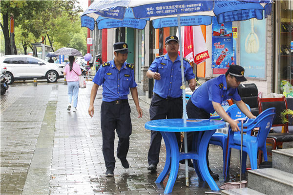 2022年7月19日,漢濱城管分局新城執(zhí)法大隊(duì)的執(zhí)法人員,冒著小到中雨,沿著巴山東路清理整頓占道經(jīng)營(yíng)和亂停亂放等不良行為。(李元武)ej3安康新聞網(wǎng)