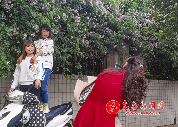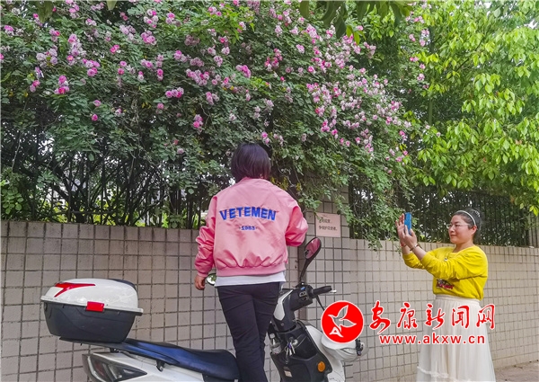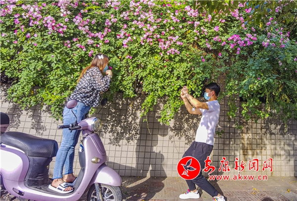 近日,安康東堤外的漢寧宮院墻上的薔薇花盛開,成了安康的網紅打卡地,每天吸引了數百人到此賞花拍照。(圖文/陳德模)