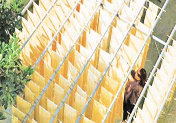 立冬之后,雨下個(gè)沒(méi)完。李云濤一直在等待太陽(yáng)的出來(lái)。憑著從父親那兒得來(lái)的經(jīng)驗(yàn),上好的麥面加入鹽水,反復(fù)揉搓,再上料斗、壓制、上桿、晾曬,成為老百姓餐桌上……