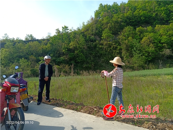 4月6日上午,陽光燦爛,天空蔚藍(lán),我騎著車到20組入戶走訪。路過東溝口時(shí),一位中年婦女頭戴草帽,在包谷地里鋤草。公路外一米左右寬的地里,種了兩行玉米,才露出兩三片葉子,長有5公分左右高。pFi安康新聞網(wǎng)